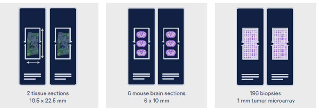 A large analyzable area provides maximum flexibility, enabling profiling of up to 5,000 genes across up to 472 mm² of tissue in six days, with faster analysis possible for panels under 500 genes. Each Xenium slide has an imageable area of 12 mm by 24 mm, with an optimal sample placement area of 10.5 mm by 22.5 mm to avoid covering fiducial markers.