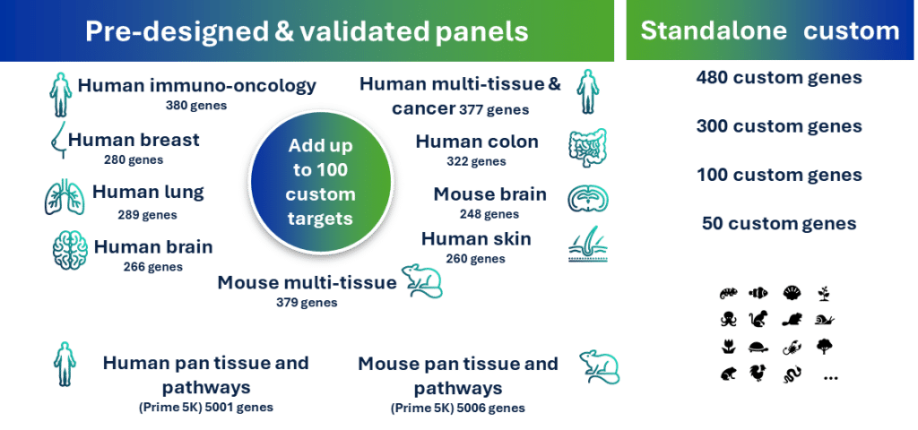 Xenium offers diverse panels to meet any research need. The pre-designed and validated RNA panels have been extensively tested by 10x Genomics on healthy and diseased fresh frozen and FFPE tissues. Xenium also offer custom panel up to 480 genes of your choice. In addition, Xenium Protein subpanels provide ready to use, pre optimised protein marker sets that can be combined with RNA panels for same cell, same section multiomic profiling, revealing both gene and protein expression within the tissue microenvironment in a single workflow.