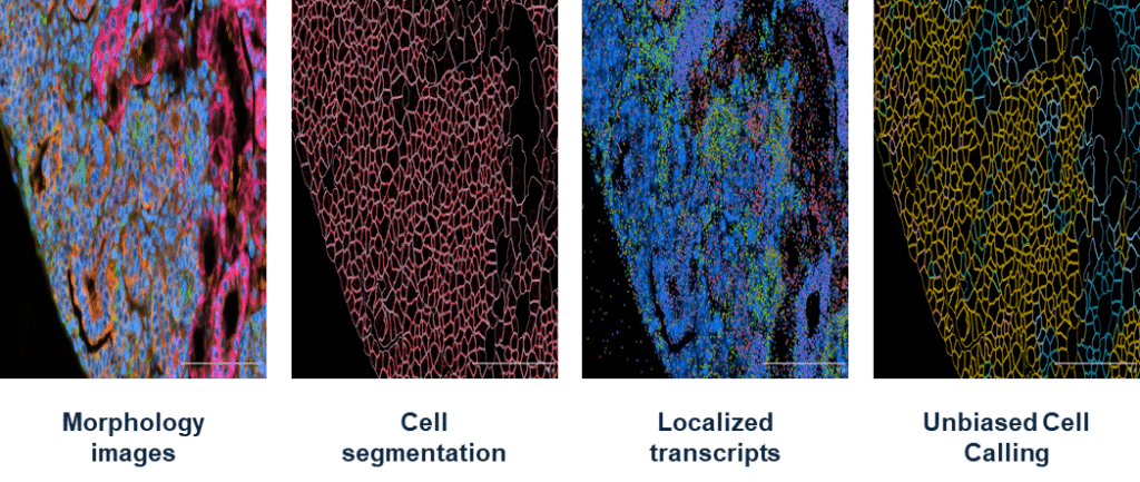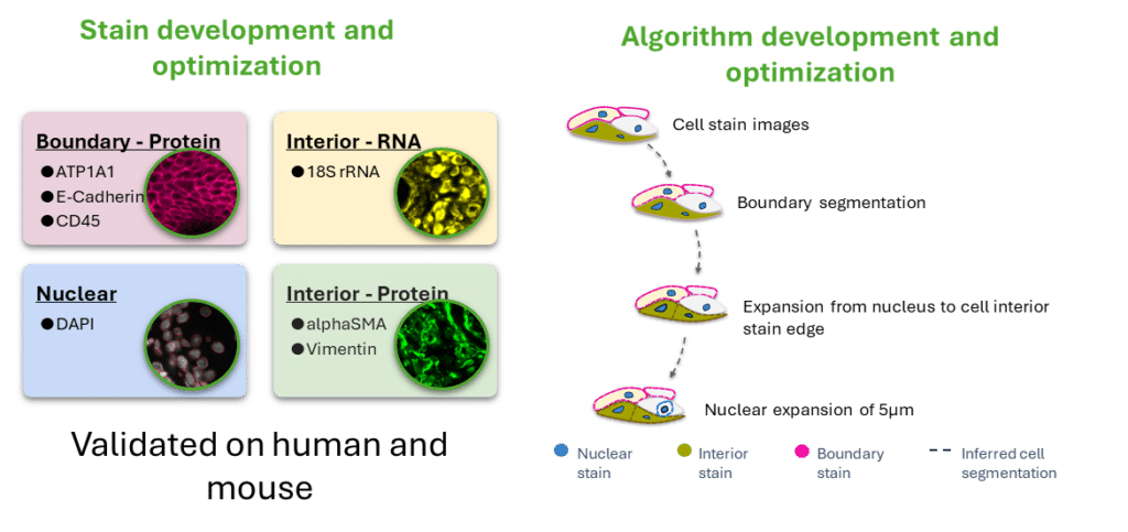 Xenium Cell Segmentation provides precise cell segmentation and accurate transcript-to-cell assignment by combining multiple morphological stains with a purpose-built, machine learning algorithm. Optimized staining protocols and advanced algorithms leverage all available image channels to define cell boundaries and capture subcellular features, enabling high-fidelity mapping of RNA and protein expression at single-cell resolution.