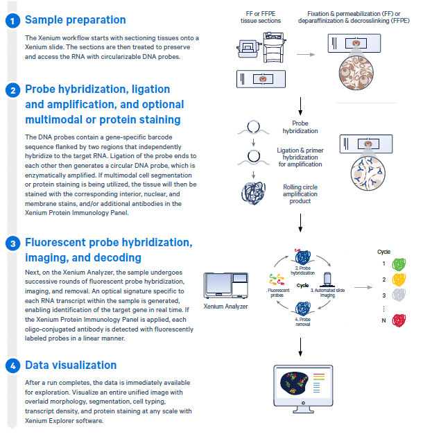 Go from tissue block to instrument-ready samples in just three days with less than six hours of hands-on time. The Xenium workflow enables high-resolution spatial gene expression analysis directly in intact tissue. It begins with tissue sectioning and preparation to preserve RNA integrity, followed by hybridization of gene-specific barcoded DNA probes to target transcripts. Probes are then ligated and amplified, with optional protein staining for multimodal analysis. Prepared samples are imaged on the Xenium Analyzer through successive hybridization rounds, generating fluorescent signatures for each RNA and protein marker. Finally, the integrated data is visualized in Xenium Explorer software, allowing researchers to explore gene expression patterns, cell segmentation, and spatial organisation at single-cell resolution within the tissue microenvironment.