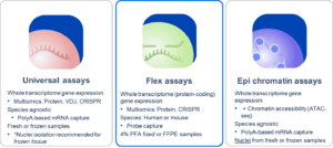 | Chromium single-cell Fixed RNA Profiling (Flex) | Transcriptomics from fixed cells | Targeted RNA expression | Compatible with fixed/frozen samples, up to 20k+ genes | Methanol-fixed cells or tissues | Biobanking, clinical samples, hard-to-process or archived samples |