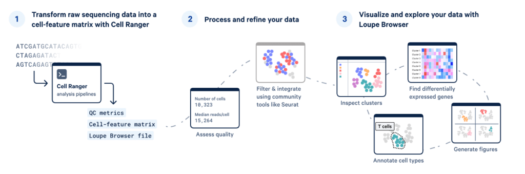 After sequencing your Chromium single-cell experiment, Cell Ranger processes raw reads to generate cell-by-gene expression matrices, perform barcode filtering, and align transcripts to a reference genome. It supports multiple pipelines, including gene expression, immune repertoire profiling, and feature barcode analysis, providing ready-to-use outputs for downstream exploration. Processed datasets can be visualized in Loupe Browser or analysed with community tools like Seurat to uncover cellular heterogeneity, cluster populations, and annotate cell types.